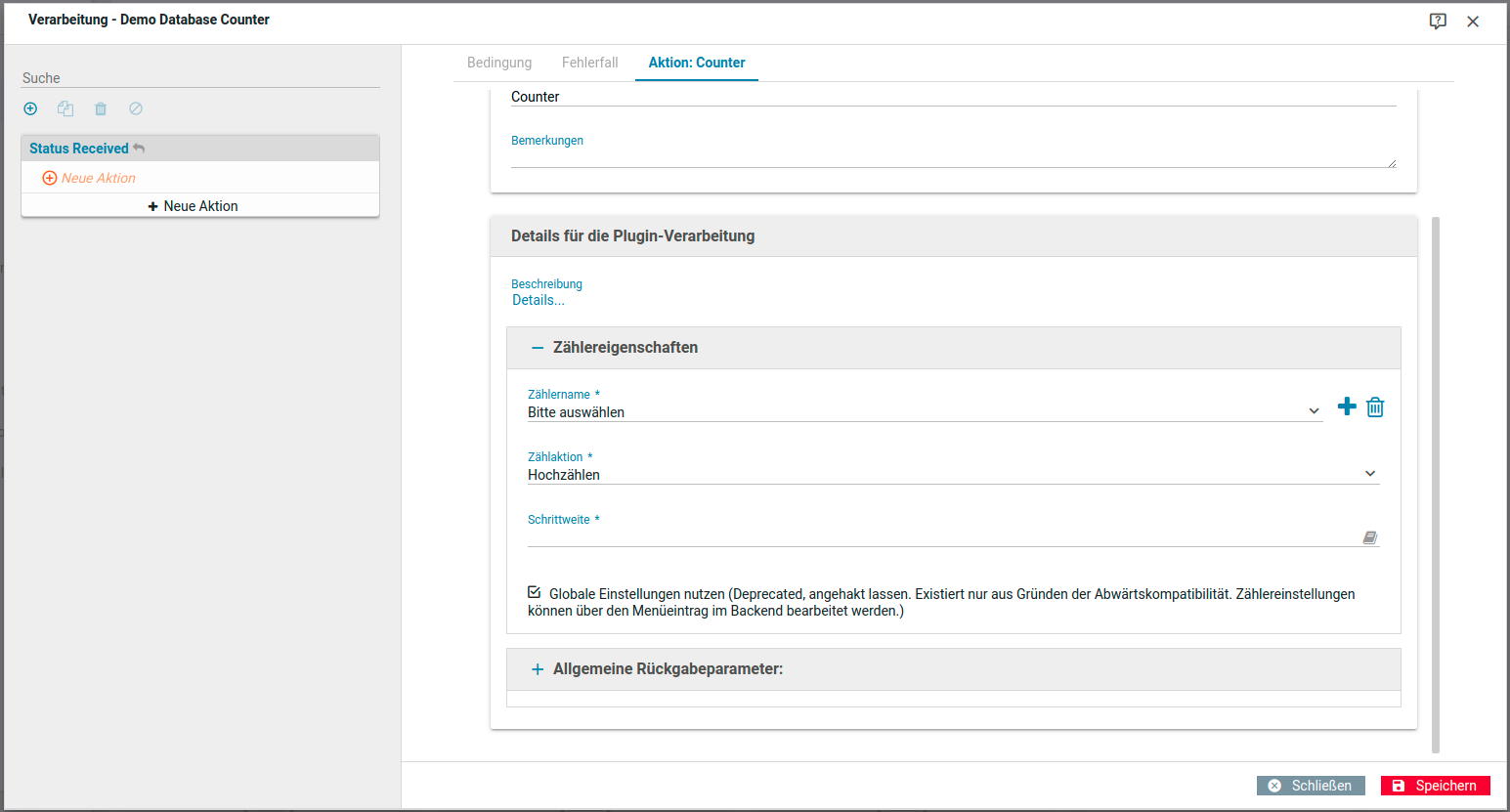 Nachdem der Zähler erstellt wurde, kann in einem Formular in der Statusverarbeitung eine Plugin-Aktion vom Typ Counter angelegt werden. Diese muss so konfiguriert werden, dass der Zähler beim Eingang des Formulars um 1 verringert wird. Dafür muss unter Zählername der Zähler BeispielZaehler und bei Zählaktion die Option Herunterzählen ausgewählt werden.