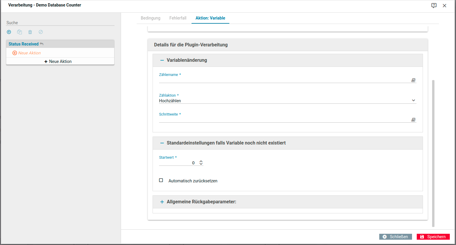 Nach Installation dieses Plugins gibt es in der Status- und Aktionsverarbeitung eine neue Aktion namens Variable. Mit dieser Aktion kann der aktuelle Zählwert eines dynamisch festlegbaren Zählers geändert werden.