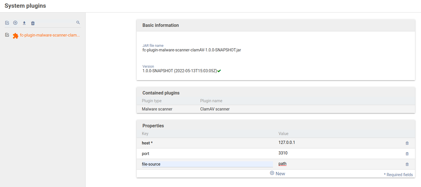 Uploaded files can be checked for viruses via the plug-in. For this purpose, this plugin is required as an activated system plugin and a running ClamAV-daemon service that can be accessed via TCP.