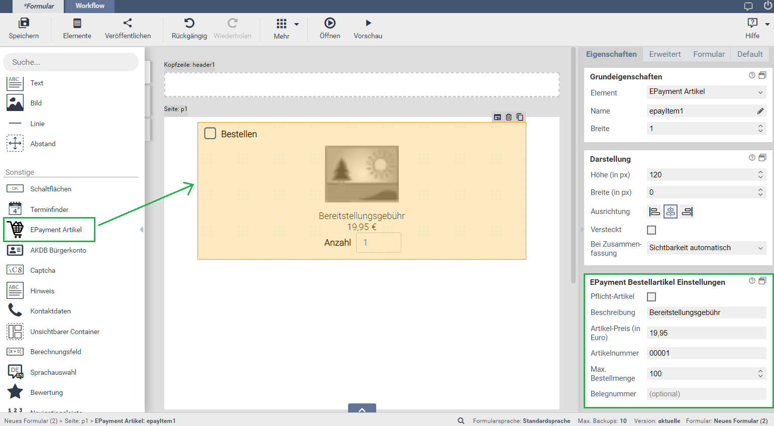 1.1. Artikel definieren durch das Formular-Element: EPayment Artikel: