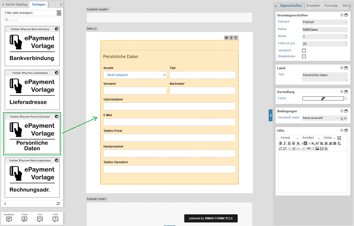 Durch die Installation des Plugins im Xima® Formcycle-System sind im Designer ein zusätzliches Element, sowie 4 Vorlagen vorhanden, welche den Nutzer bei der notwendigen Konfiguration für das EPayment unterstützen sollen.