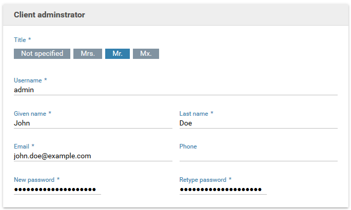 When adding a new client, a client administrator will be created automatically. You can setup the settings for the client administrator here. They can be modified later on the user administration pages.