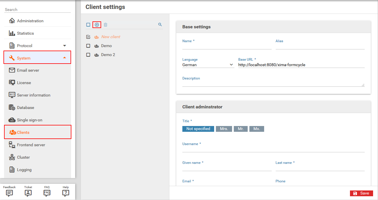 Each client is a separate instance with their own forms, users, user groups, inboxes, form record state, mail servers etc. The number of clients that can be created is limited by the license. A client can be created only the so-called super administrator or sadmin. At least one client is required for a working Xima® Formcycle Server.