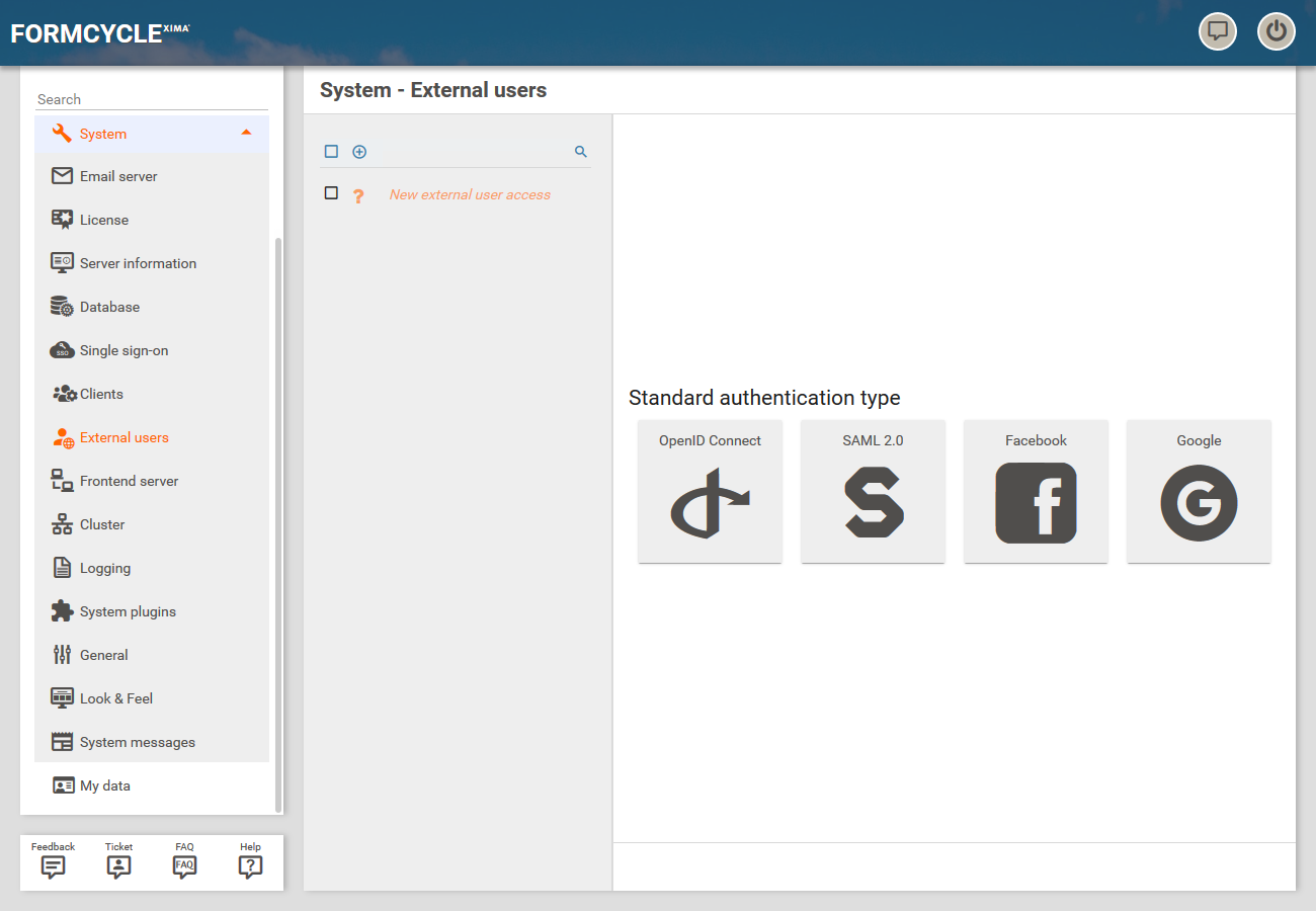 6.4.0+ This feature is subject to costs and available from Xima® Formcycle version 6.4 onwards. It allows the usage of external identity providers for the authentication of users in Xima® Formcycle forms.