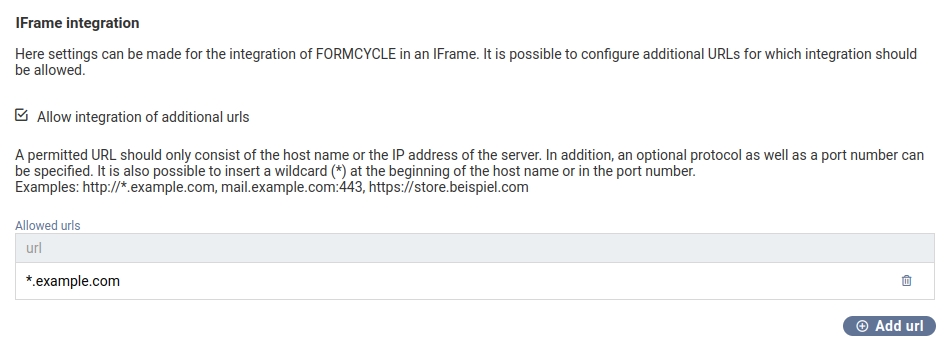 Aus Sicherheitsgründen verbietet es Xima® Formcycle standardmäßig, Backend-Seiten als IFrame in Drittseiten einzubinden. Falls dies aber einmal erforderlich ist, können die gewünschten Drittseiten hier freigeschaltet werden. Die hier eingetragenen Werte werden in den frame-ancestors-Direktive des Content-Security-Policy-HTTP-Headers geschrieben, siehe etwa mdn web docs für eine detaillierte Beschreibung der Syntax.