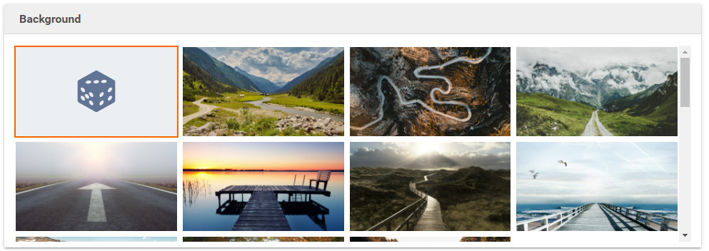 The background is visible on the login page and is also shown as a background in the backend. When you select the first option with the dice symbol , the system randomly chooses a background image each time a users signs in. Select any other option to set the background to that image. Currently we do not support uploading your own background images.