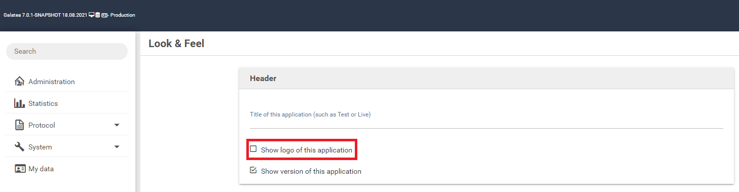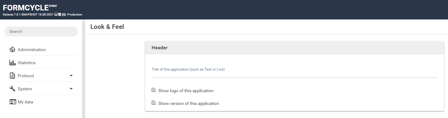 The menu Look & feel lets you customize the user interface of Xima® Formcycle, such as the logo and the name. You can also modify several links, such as to the terms of service or the imprint.