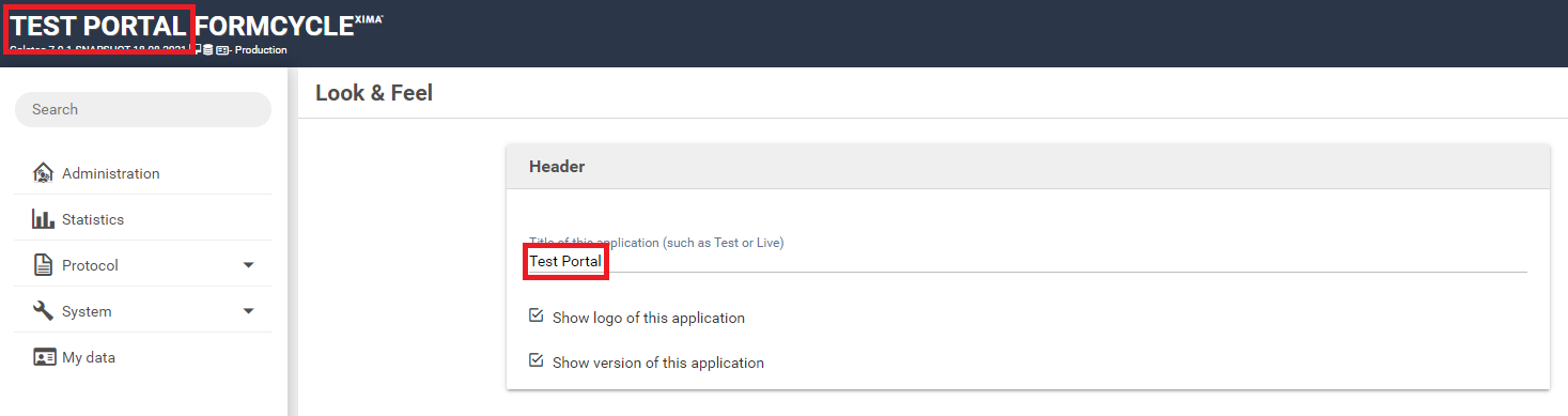 - The title you enter here is shown in large letter to the top left, next to the name FORMCYCLE. When you enter no value, only the name FORMCYCLE is shown. You can use this as a hint for users to quickly distinguish between a test and live environment.
