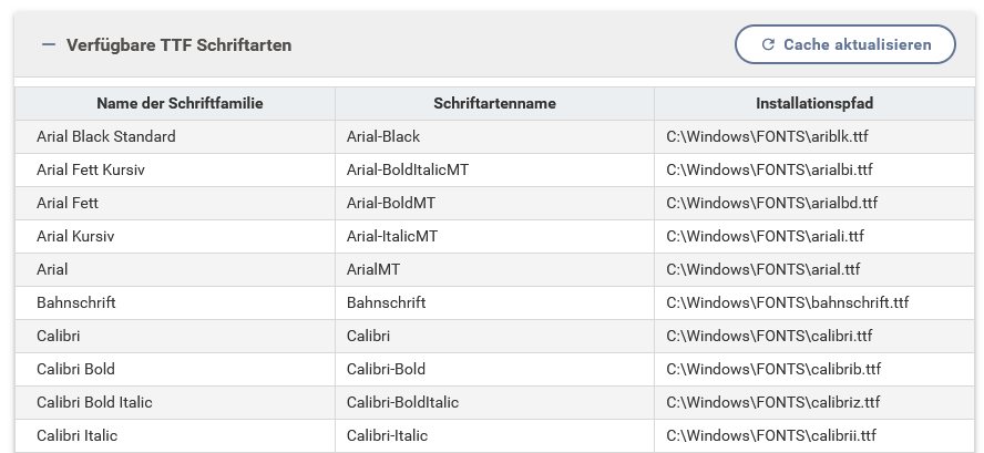 - Eine Liste von alle Schriftarten, die aktuell auf der Server installiert sind. Etwa für Aktionen wie Word-Fill müssen die entsprechenden Schriftarten installiert sein.