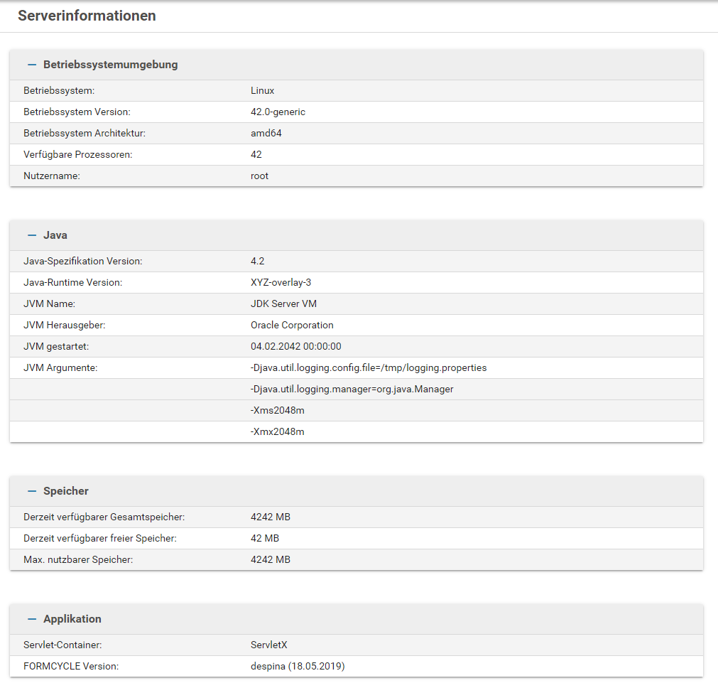 - Allgemeine Angaben zum Betriebssystem des Servers, auf dem Xima® Formcycle läuft.