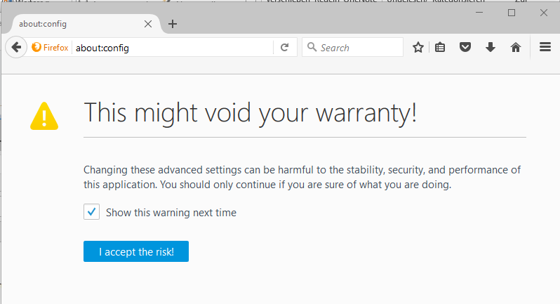 - Firefox now warns you that this might void your warranty. Click on I accept the risk!.