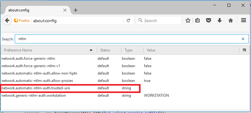 - Click twice on the entry network.automatic-ntlm-auth.allow-non-fqdn, if its value is not set to true already. It should now be set to true.