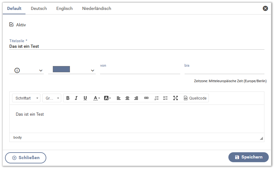- Für jede Systemnachricht kann ein Anfangs- und Endzeitpunkt festgelegt werden. Diese regeln, in welchem Zeitfenster die Systemnachricht angezeigt wird. Das Zeitfenster wird rechts oben an der Systemnachricht dargestellt.