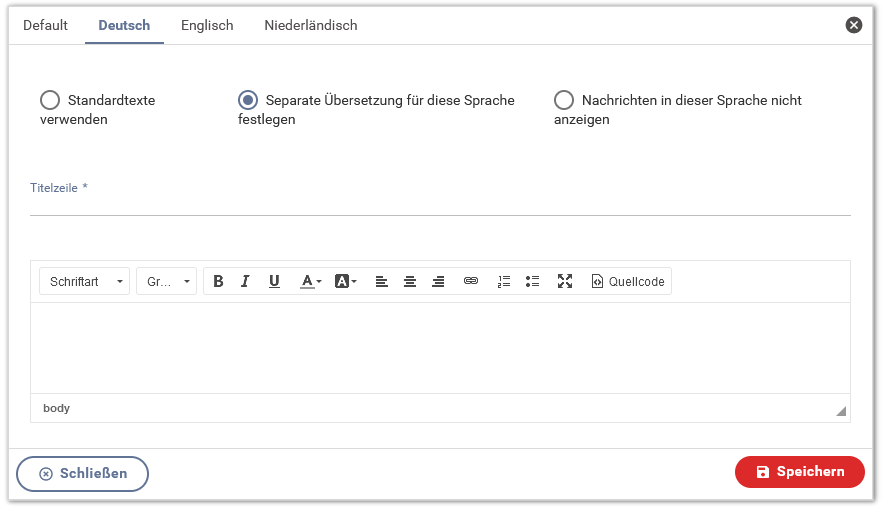 Standardmäßig wird der hier eingestellte Text für alle Sprachen angezeigt. Es kann aber auch für eine bestimmte Sprache ein anderer beziehungsweise übersetzter Text angezeigt werden. Dazu wird oben an der Systemnachricht auf die gewünschte Sprache geklickt. Hier kann nun festgelegt werden, welcher Text für diese Sprache angezeigt werden soll: