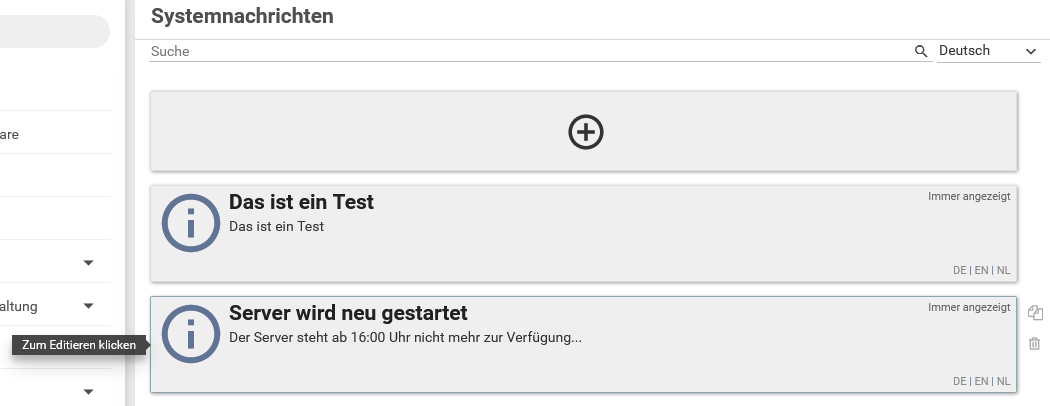 Soll eine Systemnachricht nur vorübergehend deaktiviert sein, kann diese durch Klick bearbeitet werden und hier das Häkchen bei aktiv herausgenommen werden. Um eine Systemnachricht endgültig zu löschen, wird auf das Löschsymbol rechts neben der Systemnachricht geklickt. Dieses erscheint, sobald mit der Maus über die Systemnachricht gefahren wird.