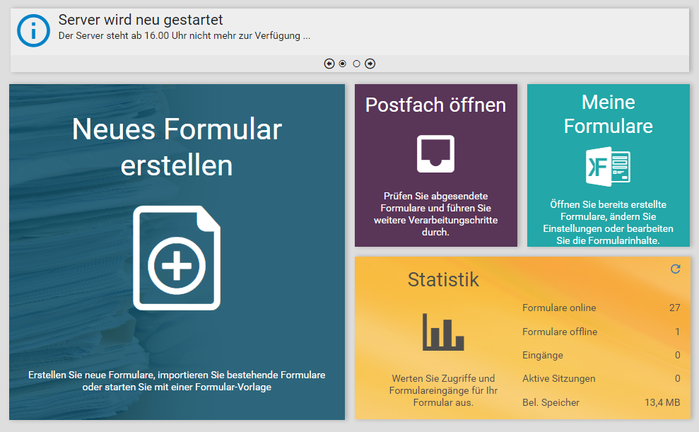 Die Startseite (Dashboard) ist die Seite, auf die Nutzer direkt nach der Anmeldung weitergeleitet werden. Hier können Nutzer schnell zu anderen wichtigen Stellen des Systems springen, etwa zur Formularübersicht oder zum Posteingang. Zudem gibt es die Möglichkeit, auf der Startseite Nachrichten einzublenden. So können Nutzer beispielsweise über anstehende Wartungszeiten des Systems informiert werden oder andere Informationen erhalten.