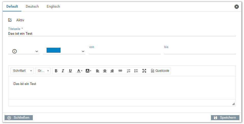 - Für jede Systemnachricht kann ein Anfangs- und Endzeitpunkt festgelegt werden. Diese regeln, in welchem Zeitfenster die Systemnachricht angezeigt wird. Das Zeitfenster wird rechts oben an der Systemnachricht dargestellt.