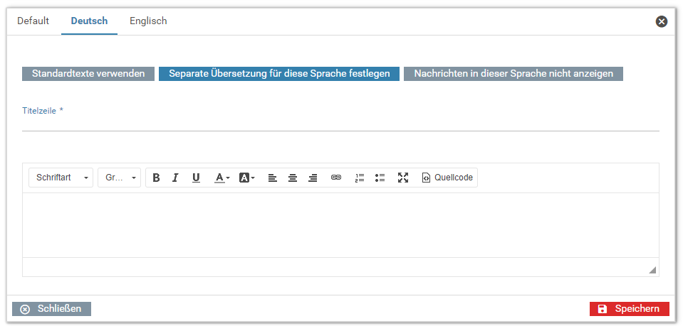 Standardmäßig wird der hier eingestellte Text für alle Sprachen angezeigt. Es kann aber auch für eine bestimmte Sprache ein anderer beziehungsweise übersetzter Text angezeigt werden. Dazu wird oben an der Systemnachricht auf die gewünschte Sprache geklickt. Hier kann nun festgelegt werden, welcher Text für diese Sprache angezeigt werden soll: