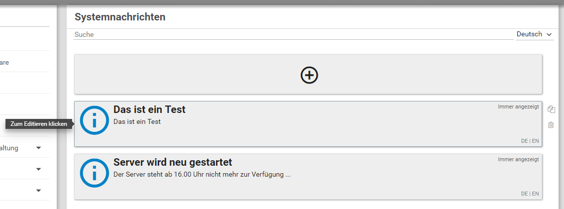 Systemnachrichten werden global für das System konfiguriert und sind in allen Mandanten sichtbar. Die Konfiguration geschieht im Systemmenü Systemnachrichten.