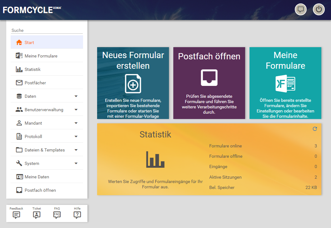 Das Benutzermenü öffnet sich, wenn man mit dem Mauszeiger über dem Logout Button platziert. Im Menü sieht man den Namen des angemeldeten Nutzers und den Namen des Mandanten in dem er aktuell angemeldet ist. Durch einen Klick auf den Namen öffnen sich in die Nutzereinstellungen. Je nachdem, welche Berechtigungen der Nutzer hat, besitzt der Mandantenname verschiedene Funktionen. Im Normalfall ist der Mandantenname ausgegraut und funktionslos. Nutzer mit Administrationsberechtigungen für den Mandanten gelangen durch das Anklicken des Namens auf die Seite mit den Mandanteneinstellungen, während der Superadministrator von Systemen mit mehreren Mandanten an dieser Stelle mit einem Menü zwischen den einzelnen Mandanten und den Systemeinstellungen wechseln kann.
