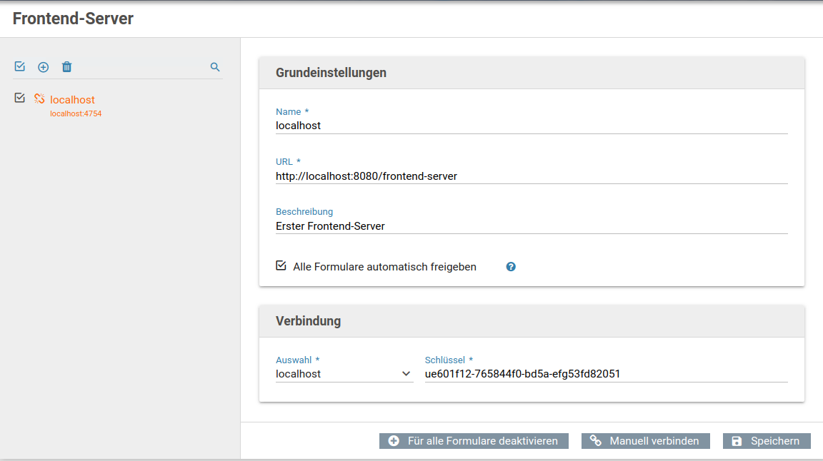 6.2.0+  Ist diese Option deaktiviert, muss jedes Formular, welches über den Frontend-Server ausgeliefert werden soll, manuell freigeschaltet werden. Wenn die Option aktiviert ist, können immer alle Formulare über diesen Frontend-Server aufgerufen werden. Über die Schaltfläche Für alle Formulare deaktivieren unten in der Aktionsleiste kann zudem die Freigabe für diesen Frontend-Server von allen Formularen entfernt werden.