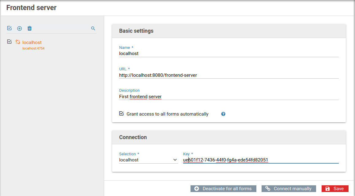 The Url of the frontend server. This Url is also used to generate links for opening the form via the frontend server, see also how to publish your form. For example: http://www.firma.de/frontend-server/