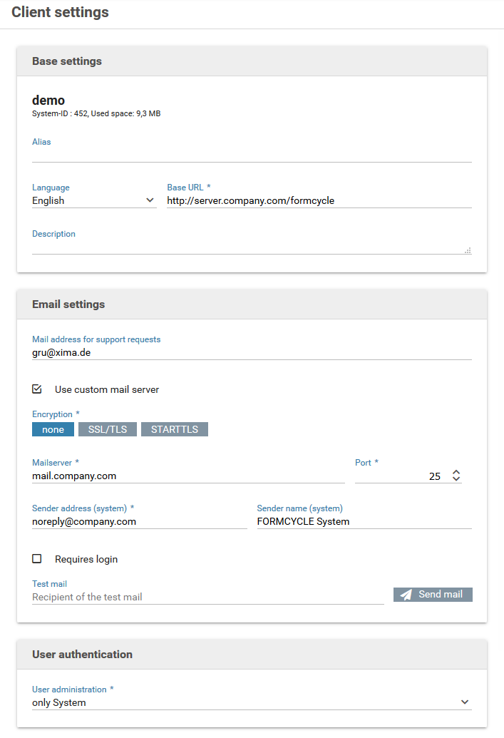 A mail server should be setup for each client. When no mail server has been configured, the system mail server will be used when it is available. In case no system mail server was configured, no emails can be sent, even if a client-specific mail server exists.