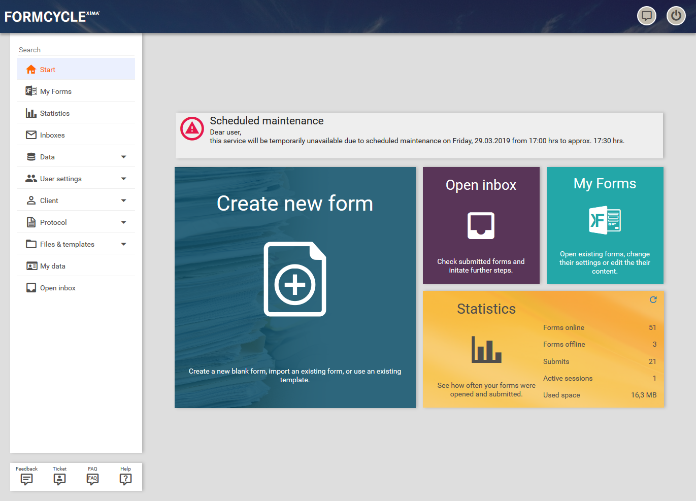 Here you will find a dashboard that, in addition to direct links to the most important actions, also contains a small statistic with the most important usage info for the current client. You can also create system messages that are displayed to all users. This can be used, for example, to inform your users about a planned server restart or downtime.