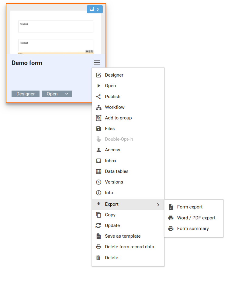 The default view shows every form as a card. These cards consist of a thumbnail of the form, a button for quick access to the Xima® Formcycle Designer, a button for opening the form, as well as a button for opening the form menu. The button at the upper right corner of a card shows how many (unread) form records have been submitted. Clicking that button will open the inbox and show all submitted form records for that form.