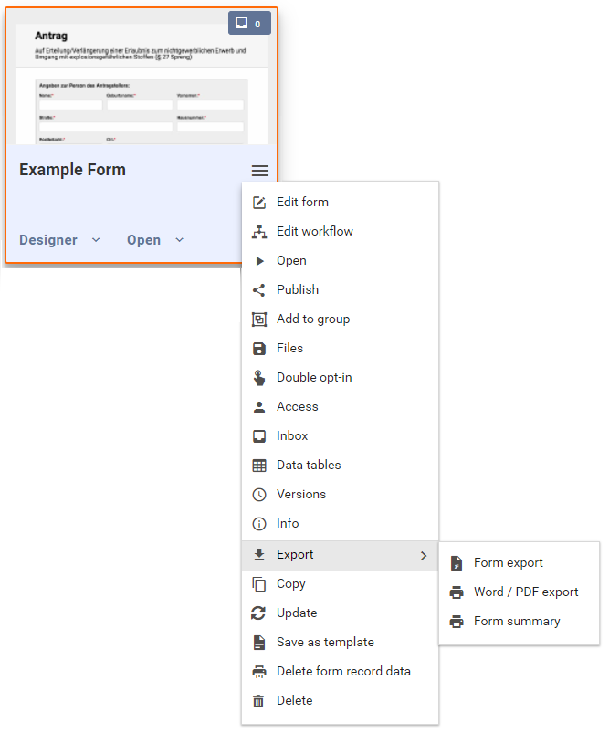 Export the entire form configuration as a ZIP file. You can import an exported form into this or another Xima® Formcycle system.