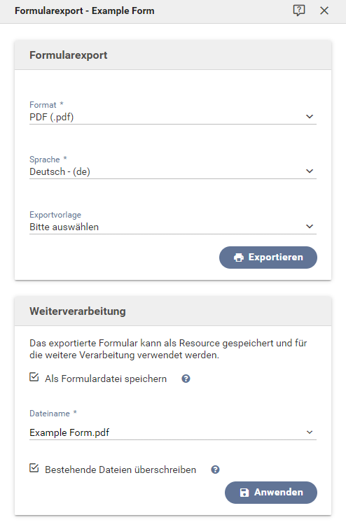 Mit dieser Option können Sie den Formularexport intern weiterverarbeiten und als Formulardatei speichern.