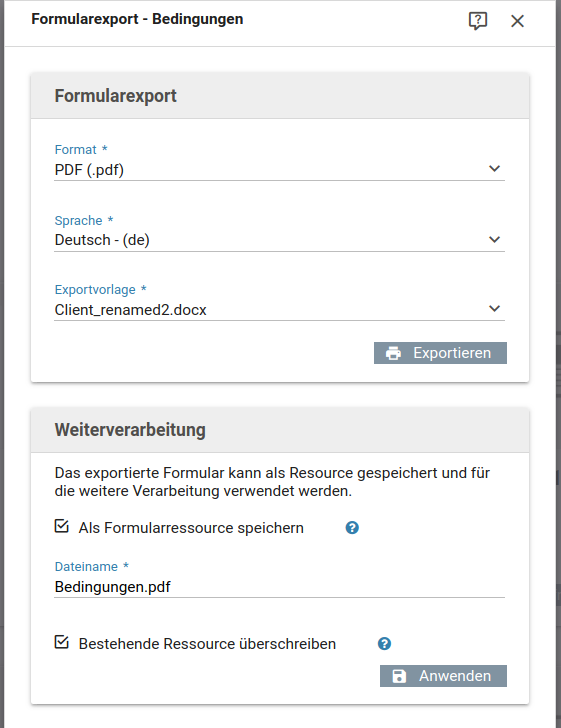 Mit dieser Option können Sie den Formularexport intern weiterverarbeiten und als Formulardatei speichern.