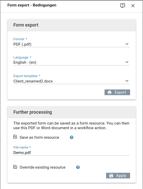This feature allows you to export a Xima® Formcycle form into a PDF or word document. Word documents created by this feature contain placeholders and can be used directly with the workflow action Word Fill. You can also saved the exported file as a form ressource.