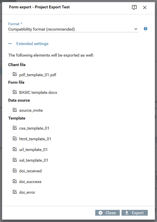 The extended settings are only available if the form has dependencies. These dependencies may be form or client files that are used in the workflow, templates that are used in the workflow, Double-Opt-In settings or directly inside the form as well as data sources that may be used for prefilling selection elements. Individual dependencies may be selected or deselected for the export.