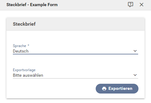 Der Steckbrief kann über das Export-Menü am Formular erstellt werden. Auf das Export-Menü kann entweder in der Formularübersicht am jeweiligen Formular oder im Designer über den Mehr-Knopf zugegriffen werden. Es öffnet sich ein Dialog für die Konfiguration mit den folgenden Einstellungen: