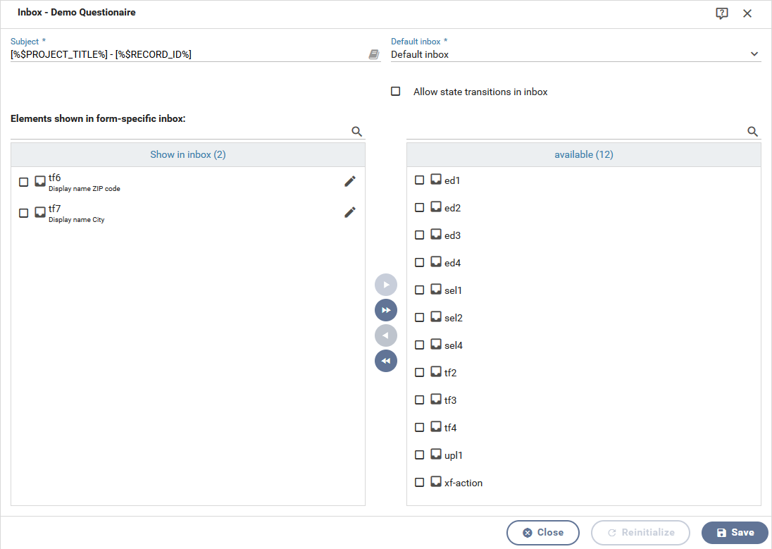 Technical elemente like ID, Subject and Inbox can be shown or hidden as required. To differentiate between normal form elements, which have symbols in front of their names in this dialog, technical elements are marked by a symbol.