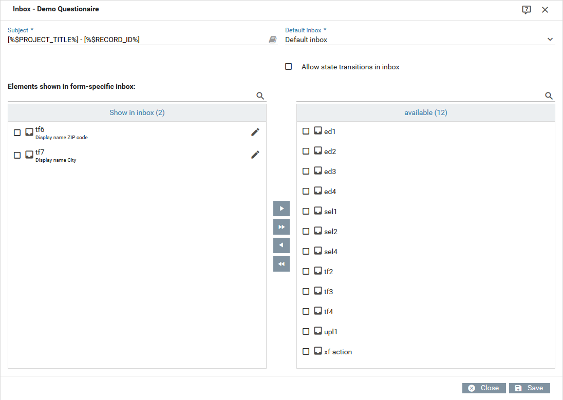 The list at the bottom of the inbox dialog shows the configuration of the form inbox view. The list on the right hand side shows all form fields available for the current version of the form. The list on the left hand side shows all columns that will be shown in the custom inbox for this form. Use the buttons between the two lists to move form fields between the two lists.