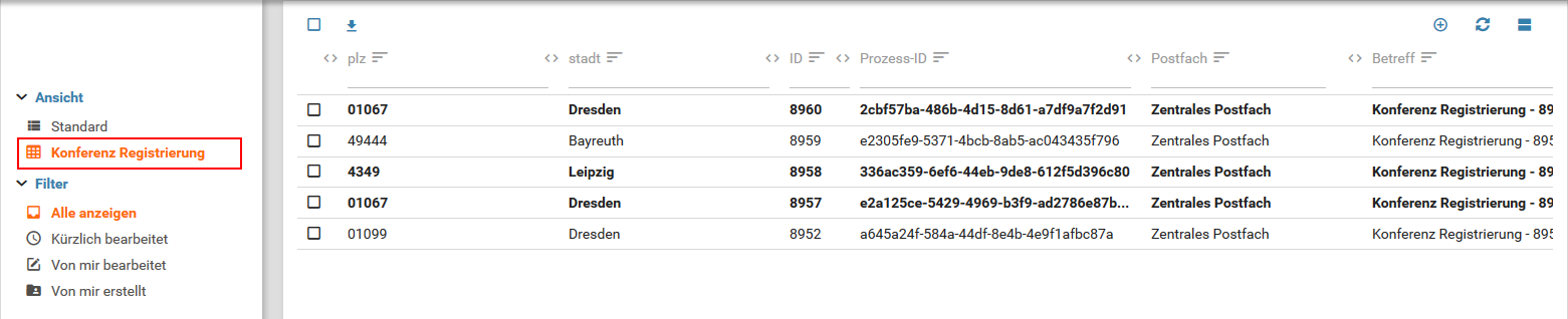 Auswahl einer formularspezifischen Datenansicht im Posteingang