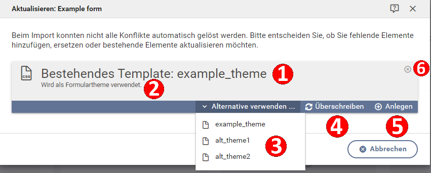 Eine Formularabhängigkeit konnte nicht automatisch aufgelöst werden. In diesem Fall gibt es eine unaufgelöste Abhängigkeit. Jede Abhängigkeit wird mit ihrem Namen (1) und einer Beschreibung (2), wo sie im Formular verwendet wird, aufgelistet. Es können alternative bestehende CSS-Templates benutzt werden, welche bereits im Backend erstellt (3). Hier existiert das CSS-Template bereits, welches als Theme für das Formular verwendet wird. Allerdings ist es nicht identisch mit dem CSS-Template aus der Exportdatei. Der Nutzer hat nun die Möglichkeit, das Template zu überschreiben (4), das Template als ein Neues anzulegen (5) oder diese Abhängigkeit zu ignorieren (6).