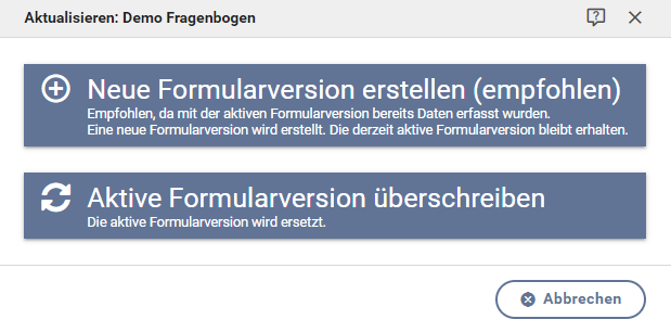 Bevor das Formular endgültig aktualisiert wird, muss der Benutzer entscheiden, ob die aktive Formularversion überschrieben werden soll oder ob eine neue Formularversion erstellt werden soll. Dies ist insbesondere wichtig, wenn Formulare aktualisiert werden, mit denen bereits Daten erfasst wurden.