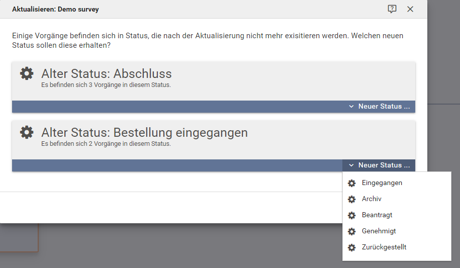 Eine manuelle Statuszuordnung durch den Benutzer ist nur dann nötig, wenn es Status gibt, in denen sich Vorgänge befinden und für die, basierend auf dem Namen, kein passender neuer Status gefunden werden konnte.